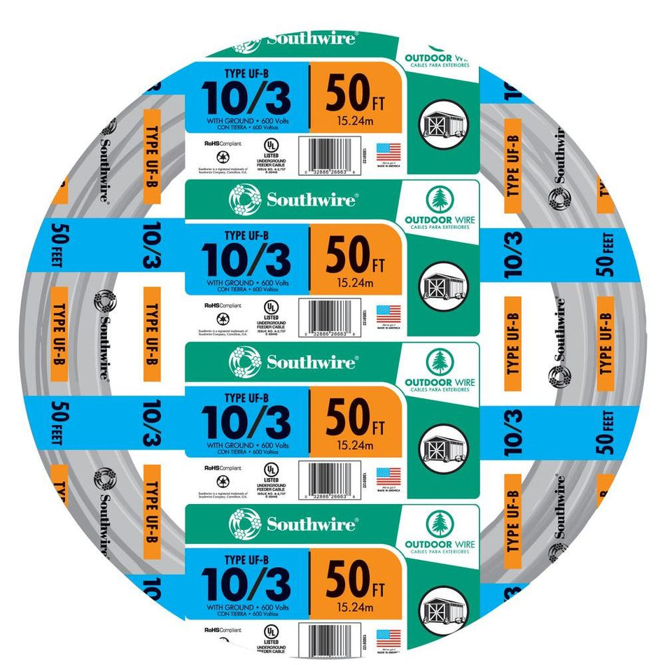 Southwire 10/3 UF-B Wire, Underground Feeder and Direct Earth Burial Cable