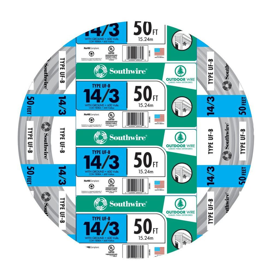 Southwire 14/3 UF-B Wire, Underground Feeder and Direct Earth Burial Cable