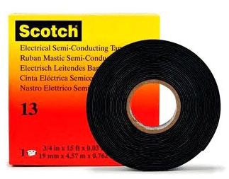 Scotch® Electrical Semi Conducting Tape 13 is a 30 mil, highly conformable, electrical semi conducting tape. This tape retains its conductivity with stretch. It offers excellent performance with the most solid dielectric cable insulations and conductors. The tape is suitable for indoor or outdoor applications. Scotch® Electrical Tape 13 is non vulcanizing and shelf stable while maintaining stable conductivity over a wide temperature range. The tape elongates easily and conforms to irregular shapes. This semi conducting, premium grade tape provides excellent shielding for cable joints on solid dielectric insulated power cables. It withstands temperatures up to 194 Deg F (90 Deg C). The ethylene propylene, rubber based tape electrically rounds out high voltage connectors and bonds to insulating materials that minimize electrical stresses. ASTM Approved and RoHS 2002/65/EC Compliant.