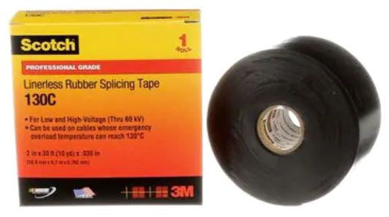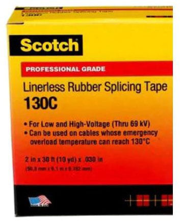 Scotch® Tape 130C is a linerless 30 mil thick, premium grade, rubber splicing tape used for splicing and terminating cables and wires. It withstands temperatures up to 194 Deg F (90 Deg C) with emergency overload up to 266 Deg F (130 Deg C). The tape has excellent electrical and mechanical properties to provide moisture seal protection.