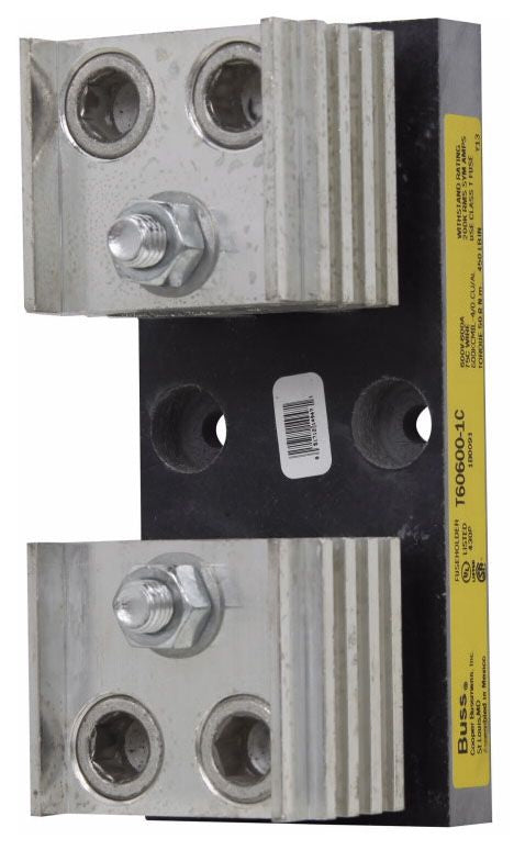 Bussmann series T600 fuse blocks are open fuse blocks for use with Class T fuses up to 600 amps in various pole configurations from 1- to 3-poles. T600 blocks use Bussmann series JJS fuses.