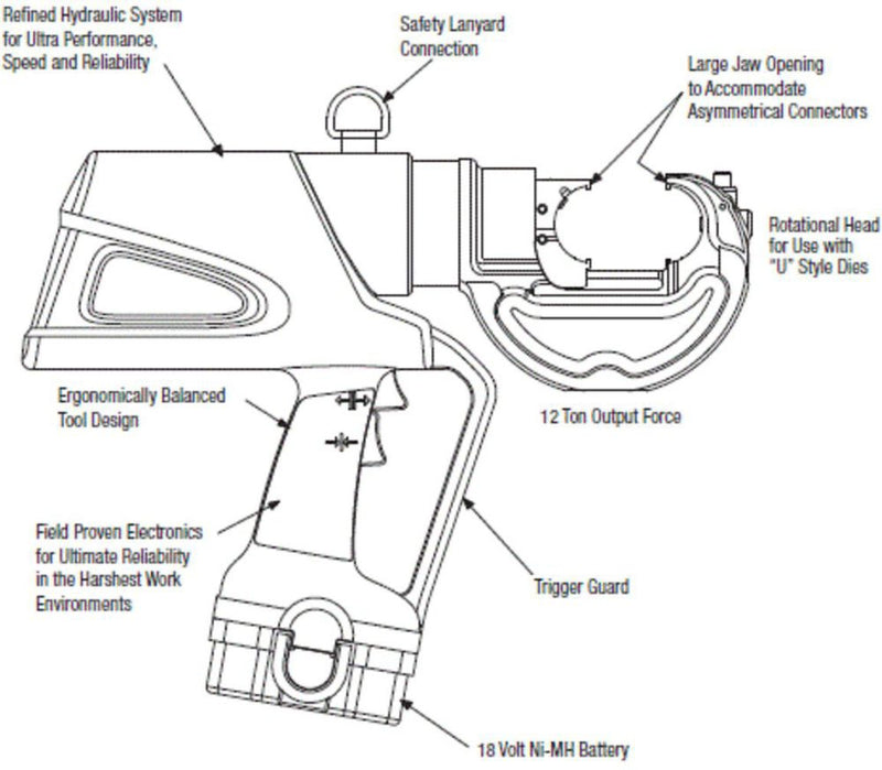 C-Head with 1.65 Inch Jaw Opening; 355 Degree Head Rotation; Uses U Dies; Ergonomic Design and Overmolded Handle for Comfort Grip; Patented T-Track Alignment Guide for Hyground as Well as other Asymmetrical Connectors; ​RoHS Compliant​; Lifetime Warranty on Infinity Drive