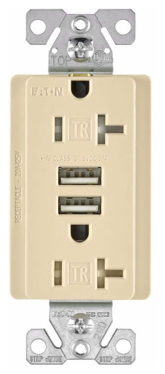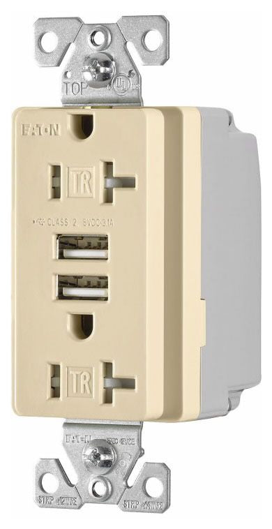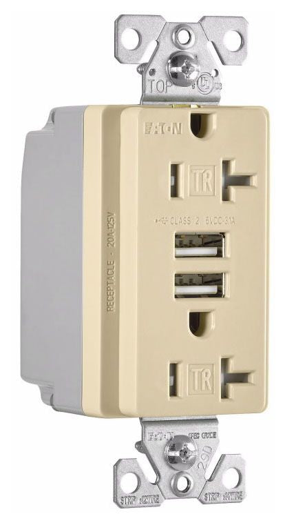 Perfect for Quickly and Easily Charging Most Electronic Components without Powered Computers or Bulky Adapters; Standard AC Receptacle with Two USB Charging Ports for Conveniently Charging Most Electronic Accessories; Dual USB Charging Ports Charge most Compatible Electronic Devices that Charge Via a 5V Power Adapter; Tamper Resistant; Automatic Grounding System Eliminates need for Bonding Jumper in Grounded Metal Enclosure and Provides Redundant Measure of Ground Continuity where Jumper is used; Thermoplastic top and Back-Body are Virtually Unbreakable to Deliver Years of Durable performance; Steel Mounting Strap is Zinc Plated for Added Corrosion Resistance; Convenient Patented Built-In Wire Strippersspeeds Installation; Backwire Clamps on Side Terminals Provide for Easy Installation of #12 and #14 AWG Wire; Triple Wipe Blade Contacts and Double Wipe Ground Contacts to Insure Long-Term Plug Retention; Replaces a Standard Duplex Receptacle for USB Charging Capability without the Need for Special tools or Bulky Adapters