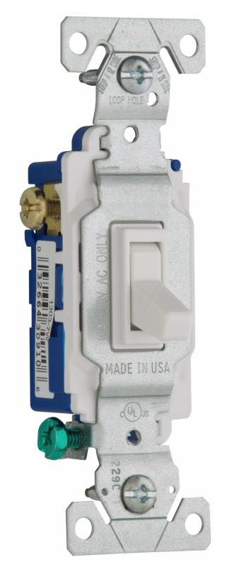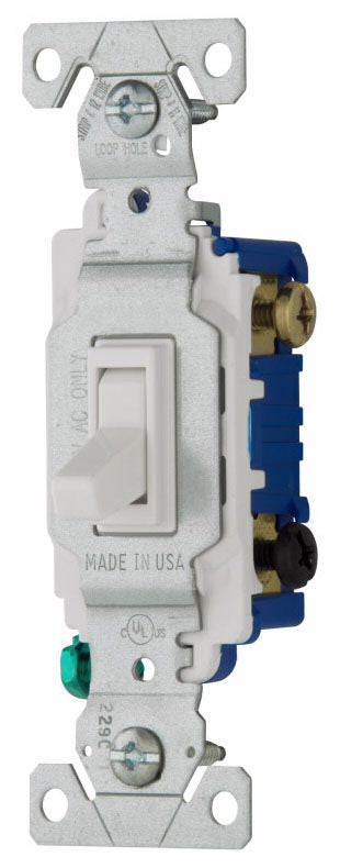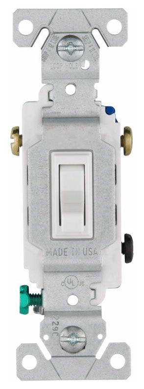 3-Way Switches Feature Additional Push-in Common Termination for Feed-Through Tapping; Push-in Terminals Accept #14 AWG Solid Wire Only; Side Wire Terminals Accept up to #10 AWG Solid Wire; Long, Broad Mounting Strap Virtually Eliminates Floating Installations; Built-In Wire Stripper for #12 and #14 Awg Wire to Speed up Installation; Tri-Combo Screws Accept Slotted, Phillips, and Robertson-Head Tools for Installation Flexibility; Wire Looper Speeds Termination of Both #14 and #12 Awg Wire; Lighted Toggle Glows in Off Position; RoHS Compliant
