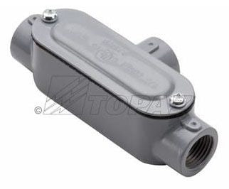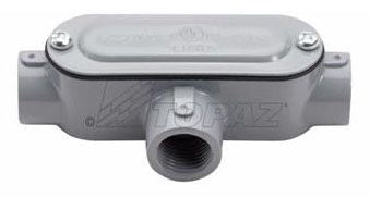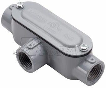 Topaz's Rigid Threaded T type Conduit Body with Cover and Gasket is manufactured from copper-free aluminum. T type conduit bodies allow 3-way inline access in conduit systems, provide easy access for splicing and pulling and can correct and change direction of conduit runs. Smooth, rounded integral bushings in hubs offers protection for conductor insulation. Excellent ground continuity and corrosion resistance; lightweight aluminum construction; cover and watertight gasket ensures weatherproof installations. UL listed.