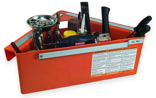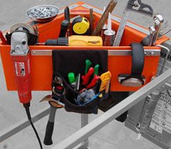 The Aerial Tool Bin offers a safe and efficient way of storing your tools at waist height while on a variety of Man-Lifts.It is designed to be used on: Aerial Platforms, Scissors Lifts, Boom Lifts, Scaffolding, Swing Stage Railings, and Mast Climbers.