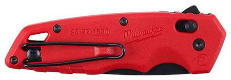 The MILWAUKEE FASTBACK Spring Assisted Folding Knife features a spring assisted mechanism and flipper for one-handed opening. The spring assisted folding knife's stainless steel blade stays sharp. This folding pocket knife features a slide lock that secures the blade while allowing for easy closure when done. The partially serrated folding knife features a tanto blade for versatility, allowing you to pierce and tear through material. This spring assisted pocket knife with durable belt clip reduces pocket tearing for maximum jobsite efficiency and includes a tether-ready lanyard hole.