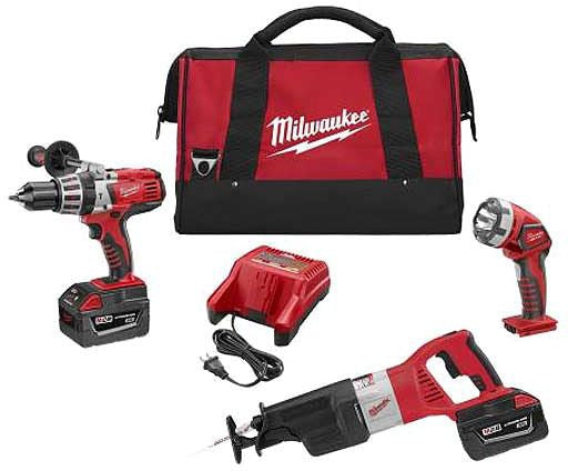 Kit Content: (1) SAWZALL Reciprocating Saw (0719-20), (1) Cordless 1/2 Inch Hammer Drill Bare Tool (0726-20), (2) Red Lithium Battery Pack (48-11-2830), (1) 28 V Charger (48-59-2819), (1) Work Light, (1) Carrying Case, (1) Side Handle