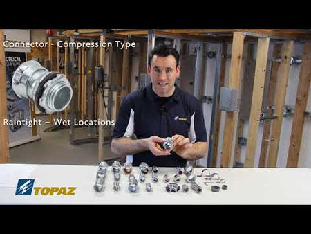 The Topaz line of efficient and dependable EMT connectors feature a compression type assembly and provide a rain tight and concrete tight connection to prevent damage from the elements and ensure continued high performance. Rugged steel construction with zinc plated finish helps preserve integrity; assemblies include steel locknut and gasket. Used to securely bond EMT thin wall conduits to electrical boxes or enclosures. Insulated throat models provide additional protection against abrasion. UL listed. NEMA/ANSI FB-1 compliant.