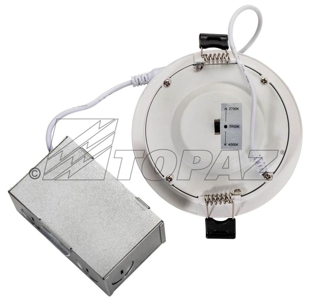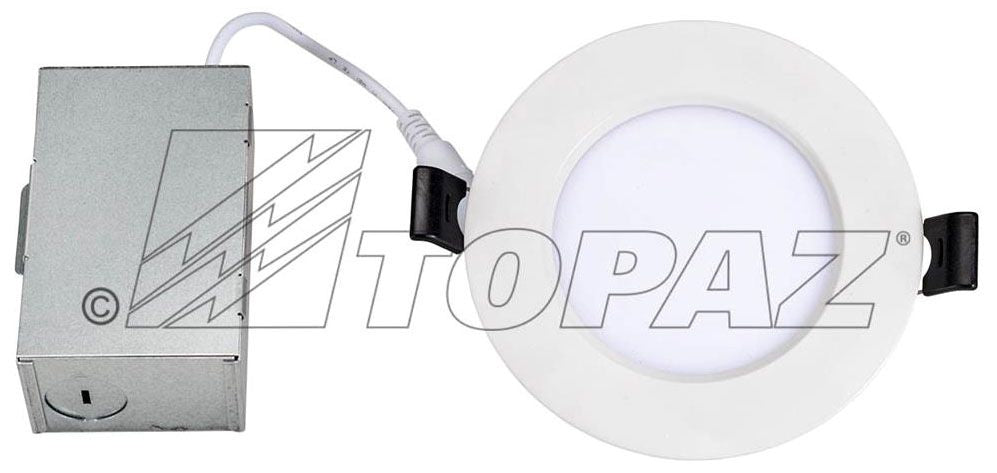 Designed for New or Remodel Applications Topaz’s LED Slim Recessed Downlights feature a selectable CCT switch for various installation options. A low profile design facilitates mounting in confined ceilings or narrow soffits. Rated for IC and damp locations, this easy-to-install fixture does not require a separate housing as it can be mounted directly into the ceiling. Optional frame-in kit available for new construction applications. Dimmable with leading-edge incandescent or LED style dimmers.