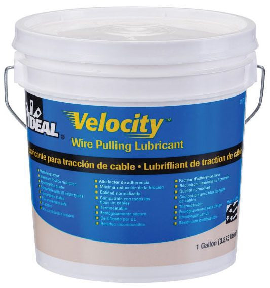 IDEAL Velocity Non-toxic cable pulling lubricant in ivory translucent color is designed with high cling factor that permits maximum friction reduction. It is manufactured without fatty acids, which means it won't go rancid or breakdown in heat. It will also dry to a powder, thereby leaving wires free to be removed later with no damage to the jacket or conduit. No lubricant dissolver is needed, unlike some competitive brands. It offers temperature stability and is compatible with all popular cables. It is environmentally safe, and has a non-toxic, non-combustible residue, is non-flammable and non-corrosive. Specification grade lubricant comes in 1 qt squeeze bottle, 1-gallon bucket, and a 5-gallon bucket. Lubricant is UL listed.