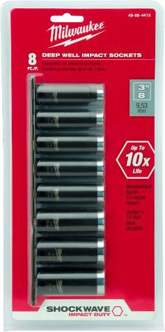 The MILWAUKEE SHOCKWAVE Impact Duty Drive Sockets are engineered for extreme durability and provide up to 30X life. The impact driver socket adapters are made from a proprietary steel, heat treated for maximum strength and durability to control hardness. The impact socket has a thin wall construction for easy access in tight spaces. The SHOCKWAVE Impact Duty Socket Adapters feature 6-point deep wells for unyielding fastener engagement and are designed for use with impact wrenches in heavy-duty applications.